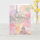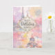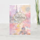 Cartão de aniversário em cores pastéis macios com uma colagem que apresenta a Torre Eiffel, flores, folhas e outras marcas de aquarela. Personalize a frente com o nome do destinatário.