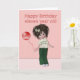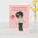 Uma garota/boneca bonitinha com cabelo castanho escuro com pitada. Ela está vestindo uma camiseta com Parabéns na frente, e calças verdes com tênis. Ela era uma arco no cabelo e um balão amarrado ao pulso. Este cartão é feito para o décimo primeiro aniversário, mas outros cartões com este design estão disponíveis na seção "Pequenas Pixies" da minha loja. http://www.zazzle.com/mycardstore