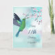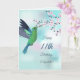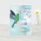 Um beija-flor verde-claro sob ramos e borboletas cor-de-rosa. Com um texto de aniversário feliz.