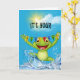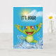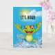 Sapo verde com faixa de aniversário saltando da água azul no fundo do céu para o aniversário de uma criança.