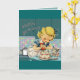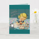 Cartão de aniversário com menina e um gatinho em uma cozinha retrô.