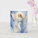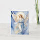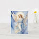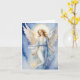 Anjo de aquarela com cabelos ondulados amarelos. Seus braços estão estendidos ao lado do corpo, seus olhos fechados e a cabeça inclinada para a direita como se estivesse em oração. "Feliz Natal" escrito em azul claro no lado esquerdo interno.