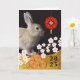 Cartão de saudação de Ano Novo chinês. Foto de um coelho esticado com ramos de flores de cereja, moedas de boa sorte e um medalhão floral vermelho decoram o cobrir do cartão. Personalize o dentro de mensagens como quiser. Arte, imagem e direitos de autor versos © Shoaff Ballanger Studios, 2022.