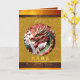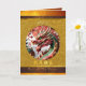 Dragão Chinês (modelo n°2) num quadro de ouro com um fundo composto por várias camadas que você pode remover, como a imagem de "madeira", que corresponde ao elemento ligado ao Dragão de 2024. Design no cartão de saudação vertical com o pequeno "Feliz Ano Novo Chinês" + ouro 2024 + saudação do ouro em Chinês + ouro "Ano do Dragão". Estão disponíveis outros modelos.