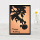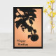 Este simples e elegante cartão de aniversário apresenta uma maçã pendurada num galho contra um brilhante céu laranja e amarelo. A silhueta escura cria um motivo oriental.