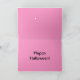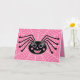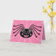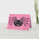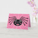 Esta aranha preta, com suas longas pestanas e bochechas rosadas, se senta em sua delicada teia. Fundo é um padrão pintado cor-de-rosa. Texto dentro "Feliz Dia das Bruxas!".