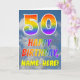 Este design de cartão de saudação de 50 anos, divertido e colorido, apresenta uma representação de um céu azul com nuvens, juntamente com um grande número "50" e a mensagem "FELIZ BIRTHDAY", tendo um espectro de gradiente inspirado no arco-íris, a colorir o padrão de gradiente, na frente. A frente também apresenta o nome personalizável do destinatário do cartão. O dentro apresenta uma mensagem de saudação de aniversário personalizada, ou talvez possa ser apagado e deixado vazio se uma mensagem for escrita manualmente. Um cartão de aniversário personalizável como este pode ser uma maneira divertida de reconhecer o quinquagésimo aniversário de alguém. [~Z0000371]