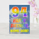 Este divertido e colorido cartão de 94 anos apresenta uma representação de um céu azul com nuvens, juntamente com um grande número "94" e a mensagem "FELIZ BIRTHDAY", ter um espectro de gradiente inspirado no arco-íris para colorir padrões de gradiente, na frente. A frente também apresenta o nome personalizado do destinatário do cartão. O dentro apresenta uma mensagem de saudação de aniversário personalizada, ou talvez possa ser apagado e deixado vazio se uma mensagem for escrita manualmente. Um cartão de aniversário personalizado como este pode ser uma maneira divertida de enviar desejos de aniversário a alguém que está comemorando seu 90º aniversário. [~Z0000371]