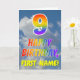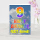Esta divertida e colorida design de 9 anos de saudação de aniversário apresenta uma representação de um céu azul com nuvens, juntamente com um grande número "9" e a mensagem "FELIZ BIRTHDAY", tendo um espectro do arco-íris inspirado na coloração do padrão de gradiente, na frente. A frente também apresenta um nome de destinatário personalizável. O dentro apresenta uma mensagem de saudação de aniversário personalizada, ou talvez possa ser apagado e deixado o vazio se uma mensagem for escrita manualmente. Um cartão de aniversário personalizado como este pode ser uma maneira divertida de enviar desejos de aniversário a alguém que comemora seu nono aniversário. [~Z0000371]
