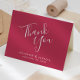 Este elegante e moderado cartões de agradecimentos de casamento minimalista apresenta um guião de letra na moda em branco num fundo magenta. Adicione os nomes dos casais e a data do casamento na fonte sans serif.