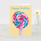 Uma ilustração original de um doce em um bastão, uma coloração gigante e colorida, do pirulito. Rosa, roxo e azul.