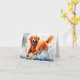 Adorável cão Retriever Dourado correndo em ondas turbilhonantes de água neste cartão de cumprimentos em branco com arte de respingo.