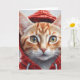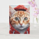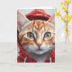 Arte em aquarela apresentando um adorável gato laranja de tabaqui com belos olhos verdes vestindo um capuz vermelho neste cartão de cumprimentos em branco.