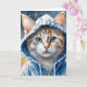Arte em aquarela com salpicos apresentando um adorável gato listrado laranja com belos olhos azuis vestido com um capuz nesta carta de cumprimentos em branco.