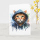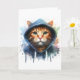 Arte em aquarela com manchas featuring um adorável gato malhado laranja com belos olhos verdes vestido com um capuz neste cartão de cumprimentos em branco.