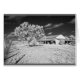 Fotografia infravermelha a preto e branco de um celeiro, árvore e cerca num rancho do sul do Texas.