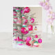Este cartão dobrável personalizado apresenta uma imagem pintada de uma árvore de purpurina prateada decorada com ornamentos de Natal antigos. Os galhos prateados estão carregados de Shiny Brites rosa e outros ornamentos antigos rosa, verde, prata e aqua.