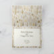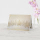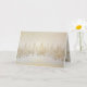 Ouro delicioso e árvores de Natal prateadas desfilam sobre um fundo branco nesta pintura de aquarela antiga. Os flocos de neve de ouro cintilante caem numa terra maravilhosa de inverno. Dentro este cartão de feriado dobrado é um padrão de pinheiros correspondente ao texto editável "Feliz Natal e Feliz ano novo". Certifique-se de editar os nomes "de" e o ano do exemplo.