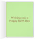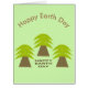 Essa grande carta apresenta uma imagem gráfica de três árvores que se assemelham a palmeiras com grandes frondes verdes de folhas e um tronco de árvore marrom resistente. Há uma mensagem em texto marrom para parecer solo debaixo das árvores. A mensagem diz Feliz Dia da Terra.