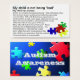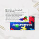 Cartão para empresas com algumas informações básicas sobre ASD "Autismo é uma perturbação neurológica complexa...Estas birras podem ser assustadoras para testemunhar. A criança tenta se comunicar......" O verso da placa tem uma imagem de quebra-cabeça caindo sobre um fundo azul retroiluminado. Estes cartões podem ser úteis quando um pai está tentando gerenciar o comportamento da criança e gawkers estão se reunindo e/ou comentando.