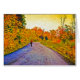 Uma mulher caminha por uma estrada alinhada com árvores em chamas com folhagem de outono.