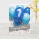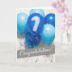 Esta é uma placa de 7 de Aniversário do Funcionário com uma imagem fotográfica colorida de balões azuis. Em um dos balões está o número 7. Há também um confete colorido digitalmente simulado. Na seção inferior do cartão, está o texto 'Parabéns!' gravado num ângulo de inclinação sobre uma caixa de texto de cinza. NOTA: O efeito de brilho dourado nas estrelas douradas é simulado digitalmente no design. Não haverá brilho na produção deste cartão. Design de Natalie Kinnear