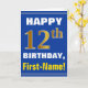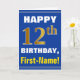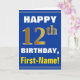 Este simples design de cartão de saudação com tema de aniversário apresenta um desejo de aniversário quente como "FELIZ 12 BIRTHDAY, First-Name!" na frente, em texto a negrito sobre um fundo de cor azul. O número de aniversário tem uma aparência falsa e imitada de cor dourada. O nome na frente pode ser personalizado. O dentro apresenta uma mensagem de aniversário personalizável. Um cartão de boas-vindas como este pode ser uma maneira divertida de fazer votos de aniversário a alguém que comemora o seu décimo segundo aniversário. [~Z0000278]