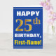 Este simples design de cartão de saudação com tema de aniversário apresenta um desejo de aniversário quente como "FELIZ 25 BIRTHDAY, First-Name!" na frente, em texto a negrito sobre um fundo de cor azul. O número de aniversário tem uma aparência falsa e imitada de cor dourada. O nome na frente pode ser personalizado. O dentro apresenta uma mensagem de aniversário que pode ser personalizada. Um cartão de boas-vindas como este poderia ser uma maneira divertida de fazer votos de aniversário a alguém que comemora seus vinte e cinco anos. [~Z0000278]