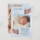 Cartão de anúncio de nascimento elegante com espaço para 4 fotos de seu próprio bebê e família, enquadradas por um layout azul moderno de burlap. O texto de boas-vindas é um arquivo separado e pode ser excluído se você não precisar dele. O verso inteiro mostra sua própria foto ou você pode escolher uma cor personalizada.