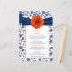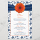 Você pode personalizar o texto neste elegante casamento de gerbera laranja (margarida gerber) azul ou azul marinho e branco damasco floral e friso ou cartão de menus especial. Para alterar o texto, use a opção personalizar. Para alterações mais abrangentes no menu, incluindo alterações na fonte, tamanhos de fonte, cor de fonte ou posicionamento de texto, use a opção personalizar. Uma escolha bonita e clássica para um casamento no outono/outono ou verão ou qualquer outra ocasião especial como aposentadoria, aniversário ou festa de aniversário.