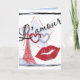 Dia de os namorados via Paris. Envie seu amor com um design vermelho e azul inspirado em francês, incluindo corações duplos, a torre Eiffel, e um beijo de batom.