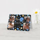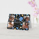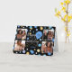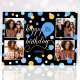 Crie um cartão de saudação de colagem de na moda! Personalize o modelo com quatro fotos favoritas, o nome do receptor e a idade de aniversário. Uma design divertida com confete redondo, balões e "Parabéns" em um roteiro de tendências. Perfeito para família, crianças, amigos e animais de estimação! Cores impressas: azul, preto, branco e ouro.