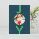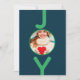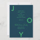 Um simples cartão de Natal minimalista, em azul e verde. Na frente: Um fundo azul clássico, com a palavra JOY escrita com letras verdes brancas. A letra O é usada como quadro fotográfico. Personalize e adicione sua própria foto de família. Fundo: fundo azul e texto verde. Adicione seus próprios cartões de natal e nomes de família. As letras da palavra JOY como decoração.