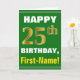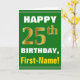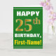 Este simples design de cartão de saudação com tema de aniversário apresenta um desejo de aniversário quente como "FELIZ 25 BIRTHDAY, First-Name!" na frente, em texto a negrito sobre um fundo de cor verde. O número de aniversário tem uma aparência falsa e imitada de cor dourada. O nome na frente pode ser personalizado. O dentro apresenta uma mensagem de aniversário que pode ser personalizada. Um cartão de boas-vindas como este poderia ser uma maneira divertida de fazer votos de aniversário a alguém que comemora seus vinte e cinco anos. [~Z0000279]