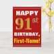 Este simples design de cartão de saudação com tema de aniversário apresenta um desejo de aniversário quente como "FELIZ 91rua BIRTHDAY, First-Name!" na frente, em texto a negrito sobre um fundo de cor vermelha. O número de aniversário tem uma aparência falsa e imitada de cor dourada. O nome na frente pode ser personalizado. O dentro apresenta uma mensagem de aniversário personalizável. Um cartão de boas-vindas como este pode ser uma maneira divertida de fazer votos de aniversário a alguém que comemora o seu nonagésimo primeiro aniversário. [~Z0000276]
