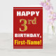 Este simples design de cartão de saudação com tema de aniversário apresenta um desejo de aniversário quente como "HAPPY aniversário de 3 anos, First-Name!" na frente, em texto a negrito sobre um fundo de cor vermelha. O número de aniversário tem uma aparência falsa e imitada de cor dourada. O nome na frente pode ser personalizado. O dentro apresenta uma mensagem de aniversário personalizável. Um cartão de boas-vindas como este pode ser uma maneira divertida de fazer votos de aniversário a alguém que comemora o seu terceiro aniversário. [~Z0000276]