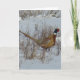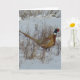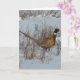 Cartão do Faisão-de-pescoço-anilado. Um belo faisão macho na neve. Essas aves multicoloridas são importadas e ainda têm dificuldade no inverno, especialmente quando a neve profunda dificulta a busca por alimentos.