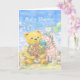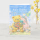 A gentle and heart-warming baby shower illustration featuring a cuddly teddy bear holding a bouquet of flowers beside a sweet unicorn.