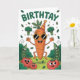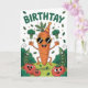 Um cartão de aniversário humorístico com uma vibrante cenoura antropomórfica vestindo um chapéu de festa e óculos de sol sobredimensionados, fazendo malabarismo alegre com os floretes de brócolis miniatura. O fundo mostra uma cena lúdica de jardim com ervilhas sorrindo e tomate peluche, todos rendidos num estilo branco, cartoon com verdes brilhantes, laranjas e vermelhos. Os elementos decorativos incluem o confete estilizado das folhas e as vinhas em espiral, contribuindo todas para uma atmosfera alegre e iluminada. O layout do cartão é limpo e equilibrado, garantindo amplo espaço para uma mensagem de aniversário manuscrita, e o tom geral é de celebração de bobos e diversão bem-naturada.