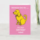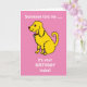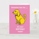 Cartão cor-de-rosa com imagem tipo cartoon de um cão feliz bonitinho com as palavras 'Alguém me disse... que é o seu aniversário hoje?. Na dentro do cartão lê-se "Tenha um aniversário adorável". Personalize facilmente este cartão editando o texto do modelo. Obrigados para ver as minhas designs.