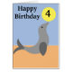 Este incomum cartão de saudação infantil editável mostra um selo bonito balançando uma bola amarela com o número 4 e a legenda "Feliz Aniversário" Todo o texto pode ser alterado para torná-lo realmente pessoal.