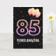 Balões de festa e confete sobre fundo negro com o neon número 85 para um aniversário de 85 anos.