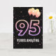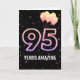 Balões de festa e confete sobre fundo negro com o neon número 95 para um aniversário de 95 anos.