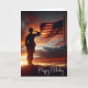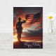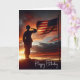 Soldado americano saudando sua bandeira com o dramático céu do pôr do sol para um aniversário patriótico. O texto é editável.