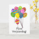 Cartão de aniversário holandês Balões coloridos. Esta placa de balão colorida é uma pintura de aquarela desenhada à mão original. Este cartão também está disponível em outras línguas que não o inglês