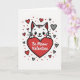 This Valentine's Day card features a hand-drawn cartoon cat head on a white background, looking straight ahead with wide dark eyes and a small, happy smile. The cat has soft grey fur with black outlines and a light pink blush on its cheeks, which makes it feel extra sweet. Its little paws hug a large red heart that sits across the lower part of the card. Inside that heart, the text reads “Be Meow Valentine” in a handwritten script style, centered and easy to spot. Around the main heart, several smaller hearts float in different shades of red and grey, with a few shown as simple sketchy shapes. The overall look is simple and warm, with the cat’s gentle expression carrying the message of affection. It’s a cute choice for a friend, crush, or partner, and it adds a little extra Valentine’s charm ❤️💌🍫.