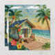 A pretty impasto beach themed blank card with a cute beach house, palm trees and tropical flowers.