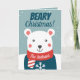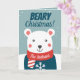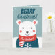 Um Enfeites de natal personalizável com um ursinho branco de cartoon divertido sobre fundo de neve, com um suéter azul e um cachecol vermelho. O lenço vermelho exibe o nome da família personalizável em uma fonte branca, elegante.