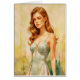 A dreamy watercolor illustration of a young woman standing at a wooden railing, bathed in warm, golden-hour light. With long, flowing golden-blonde hair and a serene, contemplative gaze, she wears a sage green and cream gown with a structured bodice and ethereal, sheer panels that drift like mist. Soft washes of yellow, green, and cream suggest an impressionistic garden backdrop, while the painterly bleeds and gentle edges lend a romantic, fantasy-inspired mood.