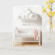 Um berço branco é enfeitado com cobertores e travesseiros cor-de-rosa, nuvens fofinhas, e uma placa pendurada que diz, "Espero que sonhes." O texto dentro pode ser alterado.